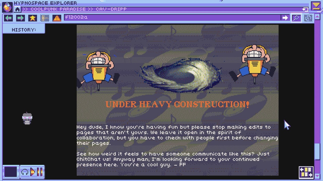 Another key difference is that Hypnospace Outlaw circumvents certain practical limitations of the world wide web, because it’s a game you download all of at once that contains something kind of like HTML. For example, heaven_online didn’t have the ability to turn off loading screens for a long time, which meant people with our bad Australian internet (or worse) had a lot of trouble navigating the mazey pages before the resources of the page got cached after seeing them once7. HTML also has other limitations, like how if you go from one page to another one that is playing the same music track, it will reset the track, because there’s no way to persist elements like that across page loads.