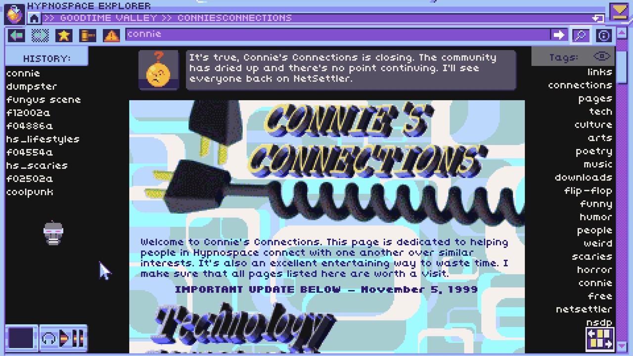 Meanwhile, Connie’s Connections is explicitly a link directory, sharing cool things from across Hypnospace in one place. These kinds of link directories have gone out of style, and no, carrd doesn’t count. Personally I think they should make a comeback. Things are linked to each other anyway; we may as well make it explicit.