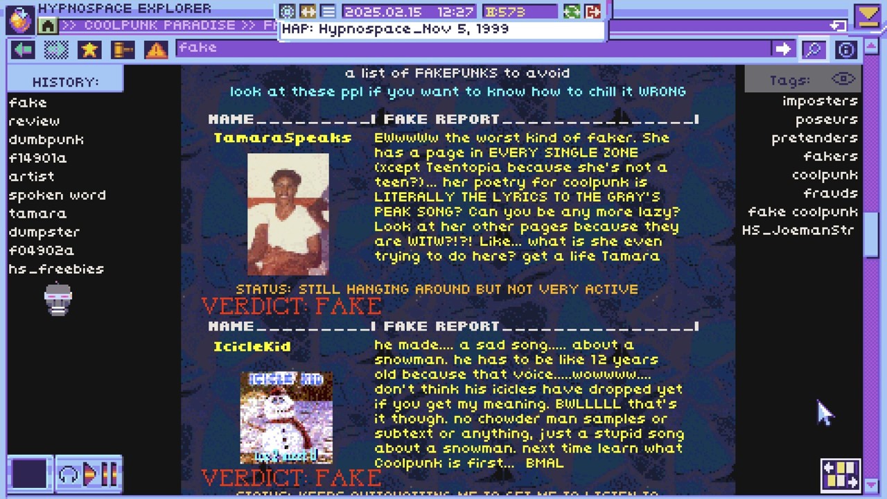 Because I hate ending nonfiction on personal notes like the above, let’s talk about the pages on Hypnospace that are writing about art, because there’s a lot of varying perspectives being shown here. For one, there’s CPColdSnap, a guy who rates Coolpunk songs based on how good they are AND how well they fit into the genre. A song can get 40/50 points for being a good song, but only 50/100 overall if it’s not proper Coolpunk. Star Wars YouTubers circa 2018 would have loved him! Notably this is the character that talks shit about Tamara’s spoken word poetry and calls her a faker, and also makes fun of Dripp Boy. Hence why I don’t like that reading of her: I don’t think the game is going for this, if this character is so dismissive of the inner world of others.