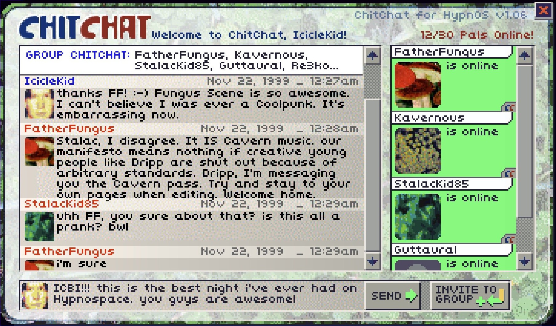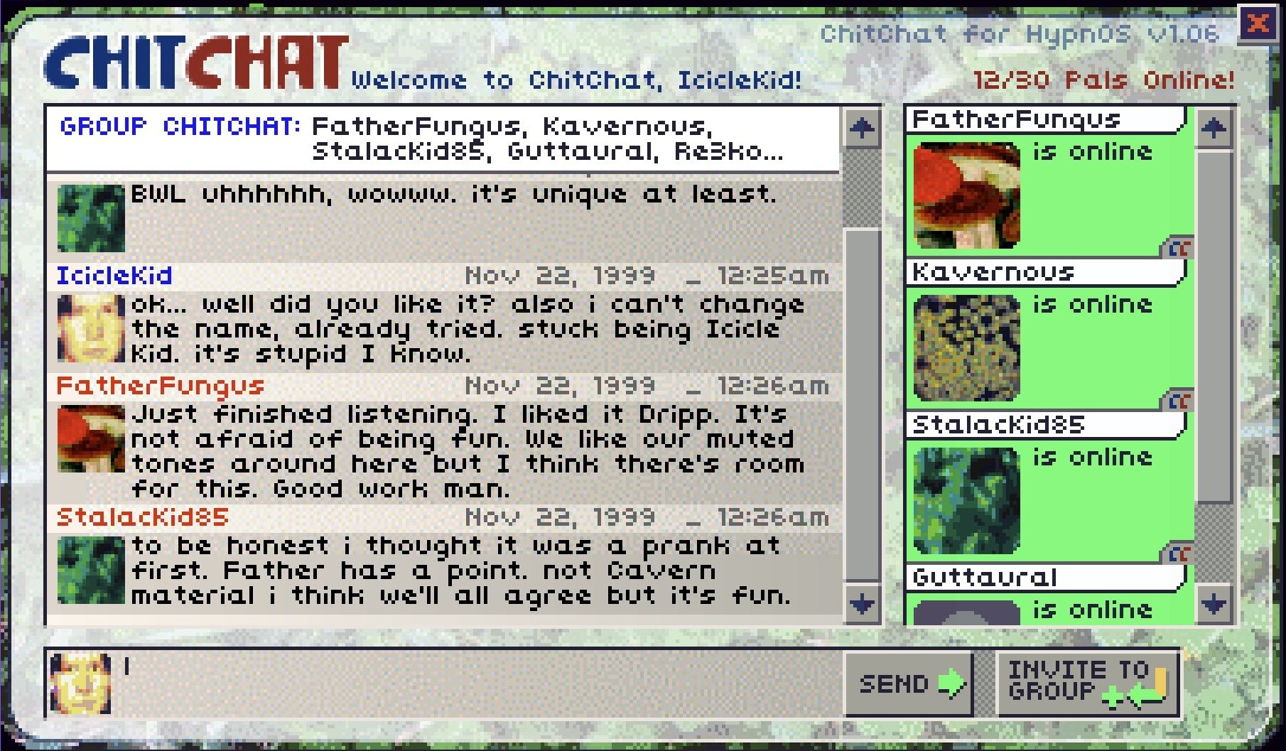 This is not the only place where people collaborate in Hypnospace: Tiff’s collaboration with Linda is another example of a collaboration between adult and teenager, and it certainly seems healthier for Tiff than her collaboration with T1MAGEDDON did. This cross-generational collaboration isn’t something I see as much of on the modern internet. There’s value in these kinds of relationships, because children and teenagers are taught by and learn from adults in real life all the time. A healthy model of the internet should include these things, in structures that don’t enable abuse of the younger party.