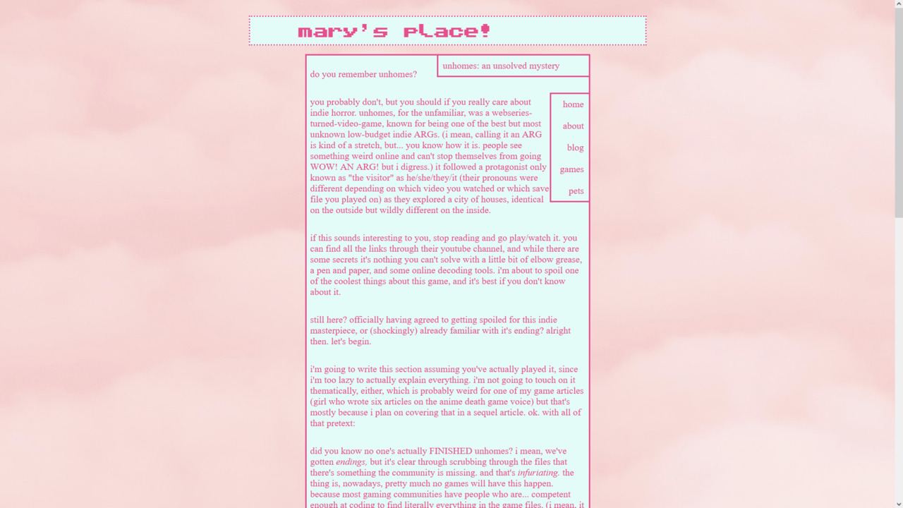 It’s comparatively small and visually simpler, but it’s attempting to be a story set in part on the indie web that exists now due to places like Neocities, where that simplicity makes sense. It tells a compelling story without using massive intricate images and animations and bespoke music and it still looks good, and you can read through it and finish it in an afternoon. Despite what Hazel said in her video about not being able to depict a coming-of-age story it still manages to be one, in a sense, though one of the things listed in its content warnings is “psychosis” so it isn’t exactly light-hearted. It’s still a story that happens in a way that’s disconnected from you, but its scope is much smaller, more focused on the thoughts and interiority of a few people than on the cosmically huge scale of the earlier sites. These two types of work can coexist: Art movements need grandiose examples that artists dedicate lots of themselves to so that readers can be inspired by the grandness of its scale, but they also need examples of great things that are DIY, so that readers can be inspired by the fact that it’s possible to make something great like that in the first place.