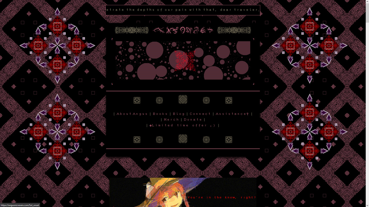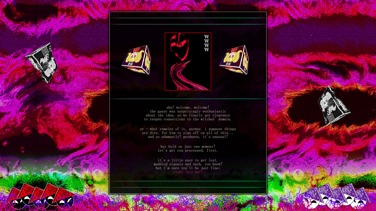 heaven_online is another site in this vein. Its about page is careful to describe momo as just a “messenger phantom of heaven_online”, but also mentions that it is intercepting and changing what it broadcasts on the site, so for the sake of ease of writing we’ll call momo its creator. The style has some stylistically similarities to Angus’ site but it has some key differences. There’s more going on from a technical perspective, for one, with a Javascript framework to build elements of pages on the fly and being easier for momo to maintain, and loading screens to ensure all of a page’s assets are loaded before you see it. Later segments can become mazes very easy to get lost in, especially once you get to Hathli, whose section I still haven’t found a way out of.