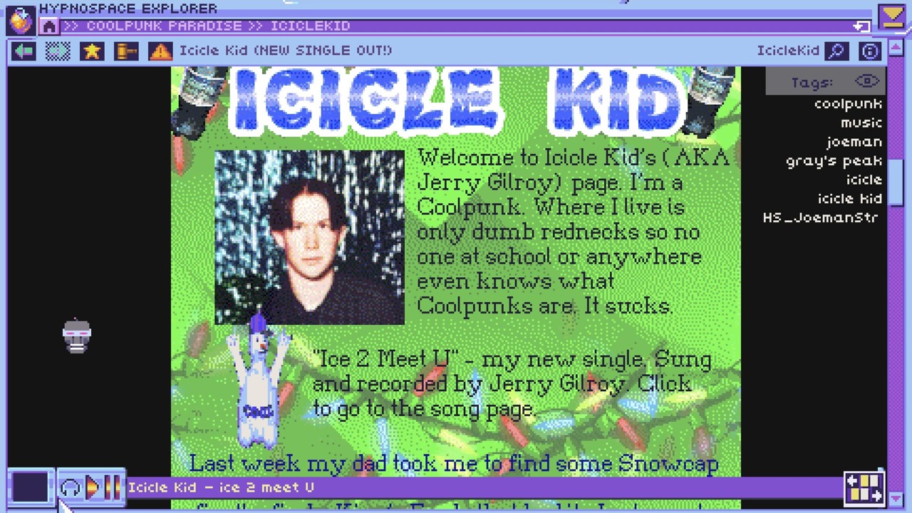 Aldrin’s House of Sound shows a different approach to talking about art. The page starts off with just scanned pages of the physical zine, with text everywhere he can’t remove due to not understanding how to make pages. As time goes on, however, he gradually becomes more and more tech literate and makes a page proper by the end, a harmony of the old technologies and the new. Other music fans like Slushmouth talk about the lineage of genres they like, of course. They chart the technological progress toward and including Hypnospace as good things, for the ways they facilitate creation and sharing of new art and new subcultures.