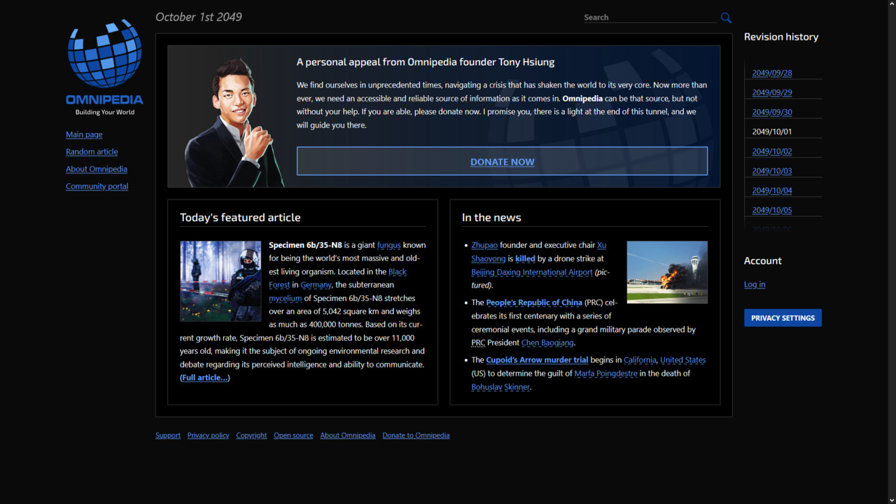 One last example, even if it’s a bit less relevant. While wikis aren’t fiction, Steven Johnson’s article considered them part of the legacy of hypertext fiction. Neurocracy is fiction, however, set in 2049 on the fictional Omnipedia, the successor to Wikipedia after it was shut down due to copyright issues. You first view it on the day that a tech billionaire is assassinated via drone strike.