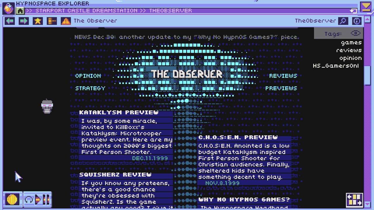 Hypnospace Outlaw is one of my favourite games of all time, yet important aspects of it are under-discussed. Most analyses I’ve seen only talk about it as a pastiche of Y2K internet or as critical of tech companies, but I haven’t really seen anyone analyse it from multiple angles I care about. For example, I haven’t seen much about its place as a piece of interactive fiction or “hypertext fiction” design, or about how its audio design ties so much together, or appreciation of its characters making and collaborating and mentoring each other about art in messy and human ways.