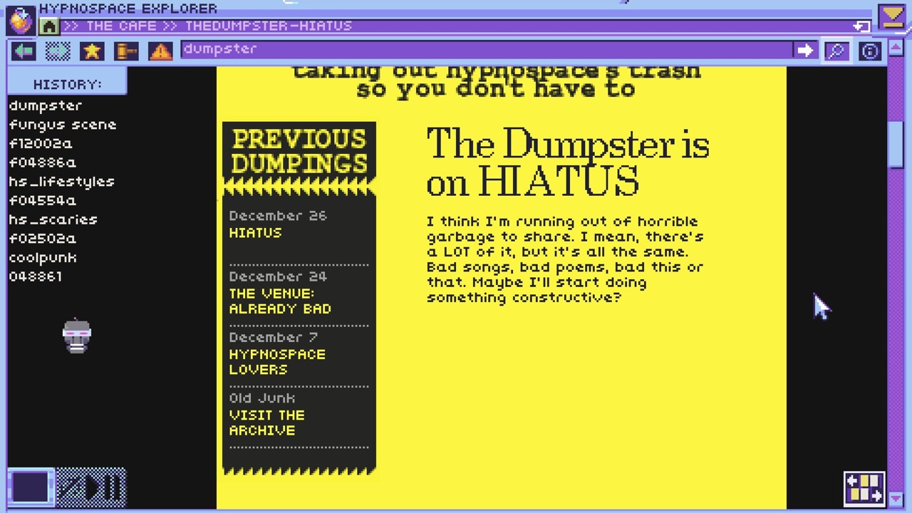 In the future I also want to talk about what Hypnospace specifically doesn’t have, namely, queerness and adult content. If you look at Hypnospace Outlaw and go “this is my ideal version of the internet! I want the internet to be like that now!”, keep in mind that you’re saying that about Hypnospace, a platform that in-universe is created by the same kind of for-profit tech startups that got us into this mess. It’s worth examining not just what is present, but what is missing, and thinking about what missing things we should reintroduce. You can read “The Two Revolutions: A History of the Transgender Internet” by Avery Dame-Griff and get a rough idea of everything I want to say there ahead of time, but I still want to talk about these two works in combination myself.