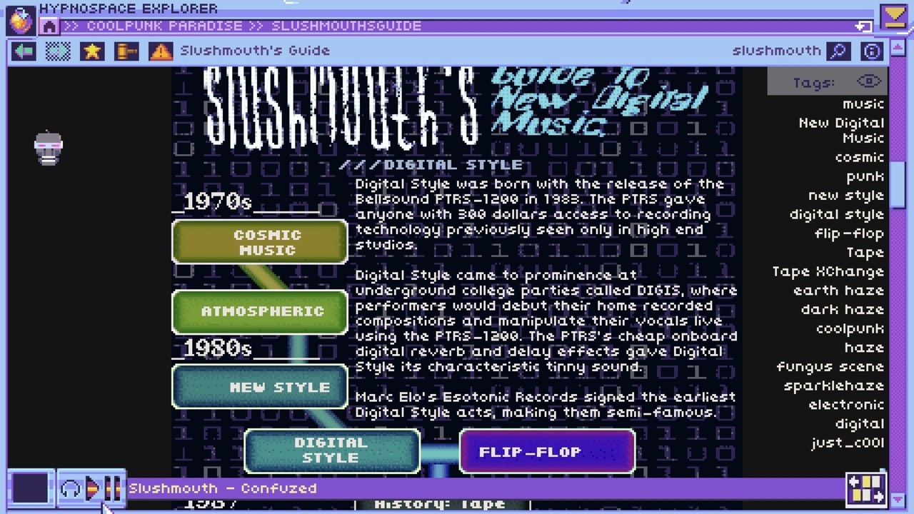 To my untrained ears, there are tracks that either have no compression on the entire file or at least significantly less. The game’s rendition of Push by RedStryke11 has barely any. The tracks by Difficulty Boy, which were made by real-life musician rj lake, also don’t have much compression. Interestingly, the Difficulty Boy tracks in-universe are ripped by a user called Slushmouth, who hosts a Hypnospace page dedicated to charting the lineage of electronic music creation and the tools that made it possible to create and distribute tracks with such ease, as someone embedded in those scene12. Slushmouth LOVES Difficulty Boy’s music, and him hosting a low-compression rip of his songs is part of how he shows that.