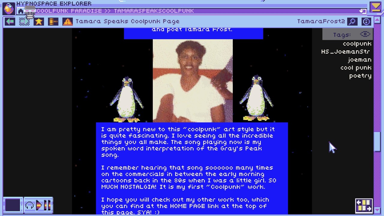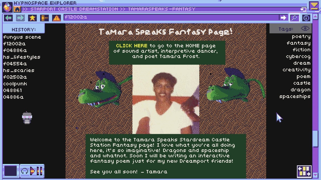 The first page of hers you see is her main page, talking about her spoken word poetry. She also has her Coolpunk page, where she has a spoken word rendition of the main source material that all Coolpunk comes from (the Gray’s Peak Cola theme). Her main page talks about her dreams of getting her poetry published, but not knowing how to do that. The last capture shows this lack of social understanding a little more clearly, though, where there are 3 pages listed in the Starport Castle Dreamstation zone. They are an ultimatum from the Sovereign Alliance of Imagination (a subcommunity planning on leaving Hypnospace), a page saying that they left Hypnospace because the ultimatum wasn’t met… and Tamara’s page, talking about how she loves the pages and community of the SAI. Obviously I’m not implying she made this only after they all left, but I’m implying that she didn’t understand the real reasons for why they did what they did, or at least how to contribute, and when they left she didn’t feel enough kinship with them to go with.